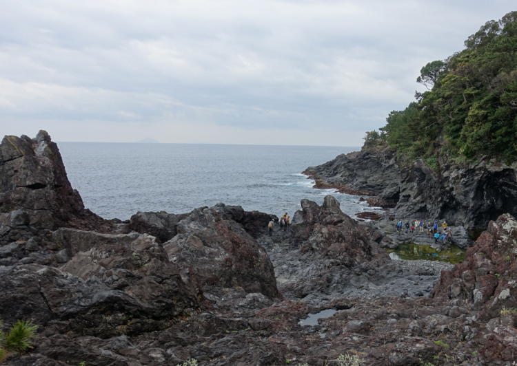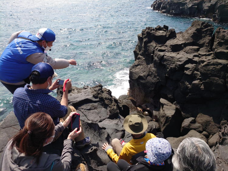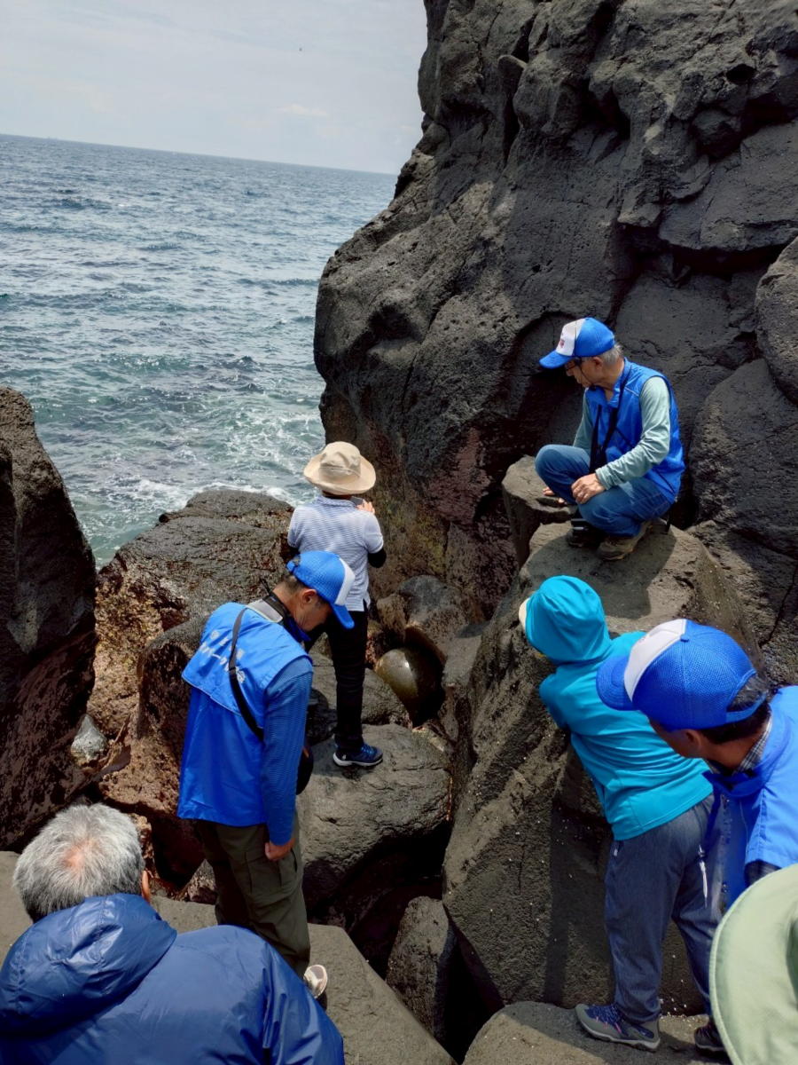 誕生真新しいゴツゴツした岩盤の浜で自然の驚異に触れながら説明を聞く一行 まつした