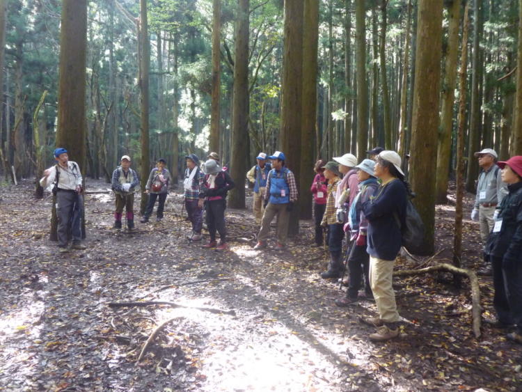 いがいが根の駐車場から林の散策路に入ると、 さっそく齋藤先生より周りに自生する トキワツユクサやホソバカナワラビについてじっくり説明を受けました。 今回のツアーも参加者全員が60〜80歳代の方々で、