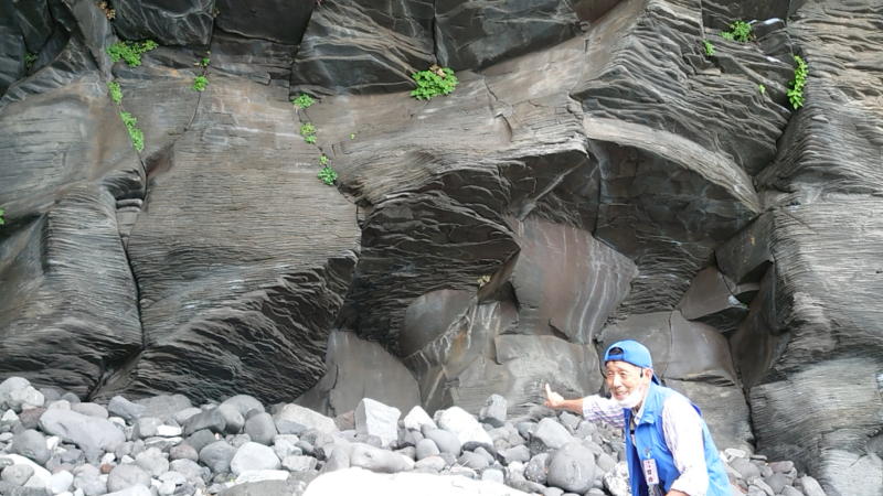板状節理・凸面節理など興味深い地形の謎解きをする齊藤先生 もとせの浜