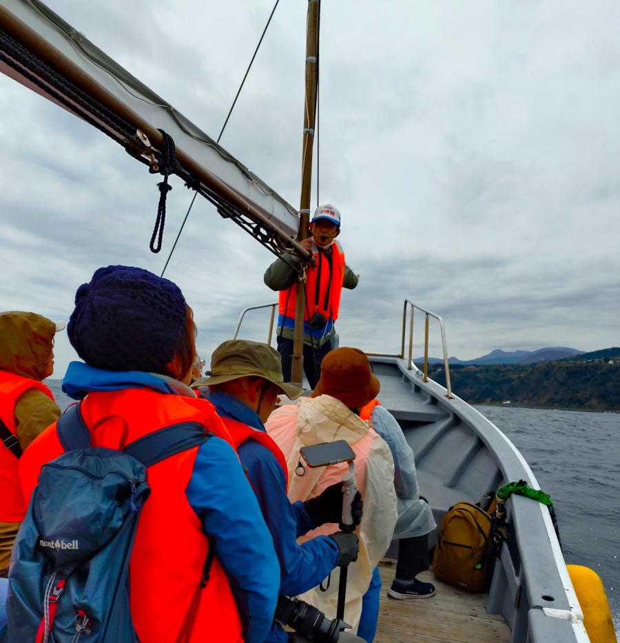 これは小室山から流れた溶岩、あれは箱根の駒ケ岳と 地形の歴史や海から望む陸の景色を解説するガイドの齋藤先生。 それはまるで海賊船の船長! 自分は今からオレンジ色のライフジャケットを身につけた仲間たちと