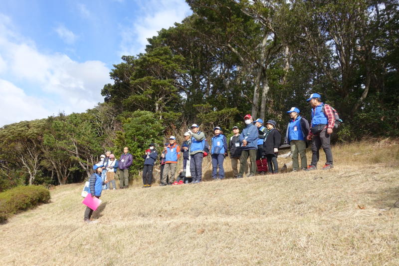 | 前日に 相当量の雨量の雨が降り、仮に天気が回復しても登山の足場は大丈夫かと懸念されました。 しかし、一夜明けると一面の青空です。安全登山を期して朝まで様子を見ていましたが、比較的に水はけのよい矢筈山の特性を考慮して,ツアーの実施を決定しました。 今日は地元の若い4人家族も,日頃目にしているゲンコツ山に登るんだと張り切って参加しました。 凛心(りこ)ちゃん(8),蓮之丞(れんのすけ)くん(12)は軽々と急坂を登って行きました。 他の参加者のみなさんも負けじと頑張りました。 途中で矢筈山誕生について、また構成岩石の特徴などについても学びました。 大量の降水のあった時に出現する通称「まぼろしの池」では水深が大人の身長程にも達することを聞いて参加者のみなさんはびっくりしながらあらためて周りを見渡していました。(写真:まぼろしの池で説明をする斉藤俊仁先生=左はし と参加者たち) 山頂から少し下のところに「ビューポイント」と呼ばれる富士山がよく見える地点がありますが、今日,ここに通りかかった時はきれいに晴れ渡り、くっきりと雪をいただいた富士山を見ることができ、歓声とともにカメラのシャッター音がしばし鳴りやみませんでした。 運悪く、頂上に立った時に霧が発生し,最高点からの眺望を楽しむことはできませんでしたが、みなさん、伊東市で一番高い急峻な岩山に登ったという満足感にひたっておられました。 今日も一人のケガもなく,紅葉の秋の登山を楽しんで頂きました。 H記 |