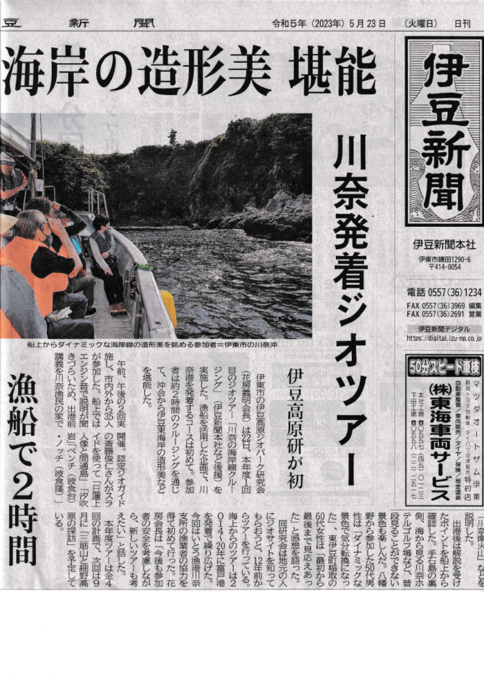 | <10月24日> 斎藤先生の座学後乗船。 爽やかな秋の陽に透けた湾内の水はキラキラと輝いて、ミニクルーズへの期待が高まりました。 いざ出港・・・前方には伊豆諸島の島々が、振り返ると大室山の流した溶岩の動きが手に取るように見て取れました。「払火山の存在がハンパない」というのが海から眺めた感想です。 かぐら根や岩脈も陸からでは想像が難しい迫力でした。 遠望で島々や山々、そして富戸、城ケ崎、浮山(赤沢)の海岸を堪能した後は出来る限り岸近くを通り、細部を観察、要所要所で運航をストップさせて下さる船長さんの腕に感服!伊豆大島と新島、大室山と矢筈山等形成過程の違いも歴然!海上からの観察はとても分かりやすいことに気が付きました。 時には潮を浴び健康浴も! 事前研修が功を奏し、ガイドの一言一言への反応が皆さんのうなずく動作に見て取れ、コロナ問題がなければもっと華やかなお声が聞けたのではと少々残念。 ガイドの歴史的な話や経験談も交え盛りだくさんの内容に「楽しかった」のお声を沢山頂けました。 陸では絶好の行楽日和であっても海は荒れている・・・これが秋のクルージングの難しさなのでしょうか。残念ながら10月31日は実施できませんでした。 そして <11月4日> 前夜の風が嘘のように静まり文句なしの快晴の中、今季2回目のミニクルーズが富戸港を出発。定員ぎりぎりだった前回に比べ、船足も軽々と進みます。快適この上ないコンディションではありますが、やはりコロナが頭をよぎり、お客様は全員紳士淑女!お互いに気を使い、粛々と進行。お陰で内容の充実した「大人のイベント=新しいタイプのイベント」を行うことが出来ました。 そんな中から辛うじて拾えたお客様の反応は ・普段と異なる体験ができた ・船ならではの観察が出来た(しっかり写真撮影) ・いろいろな話が聞けた ・ストレス解消になった ・ジオって楽しい などでした。 最近この地へいらした方、土地っ子の方、退職後伊東での暮らしを満喫中の方、現役バリバリの方など様々なお客様が参加され、遊覧船廃止となった今このイベントに参加できたことをラッキーと喜んでいただけたようです。 H記 |
