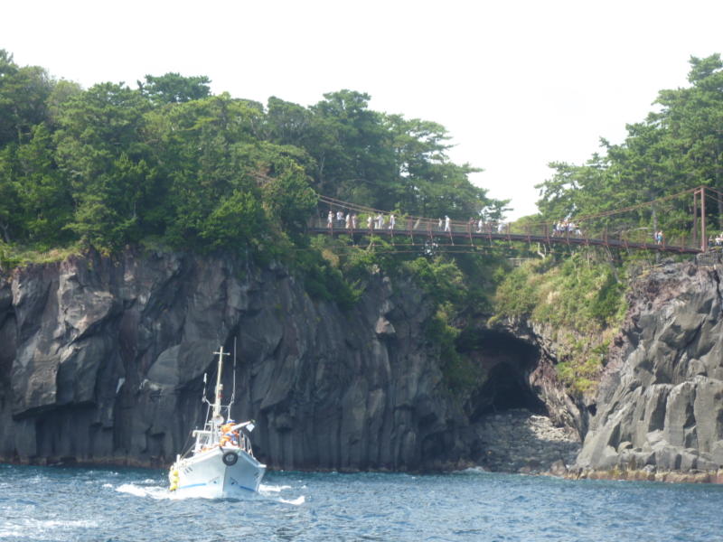 まず目を引くのが、横瀬の絶壁に入った赤い筋。 それから海食洞、岩脈、かつて伊東の名勝地と言われた間通島と 自然のすごさと不思議さを感じさせる地形が 次々と目の前に現れる。 途中に、磯で岩の間を歩いている人が見え、