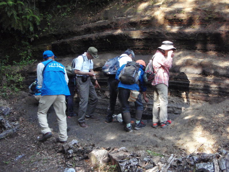 | 1週間ほど前には「一時雨」のマークがついていたこの日の天気予報は見事に外れ。 梅雨期を前にして絶好のハイキング日和となりました。 これぞ晴れ男と晴れ女がひしめくジオ研の面目躍如,こういう天気を称して「ジオ天」という,とジオ研の会長も上機嫌です。 いつものように参加者の皆さんは早めに集合されたので,スムーズに座学を開始。 今回はジオパークの基礎と大室山の成り立ちを知る「伊豆高原の成り立ち(単成火山群を学ぶ)」。 大室山の誕生時期を決定づける決め手となった炭化木の発見者でもあるジオ研のメインガイド・斎藤先生が炭化木発見当時の苦労話などを織り込んで丁寧に解説され、参加された方々も熱心に傾聴しておられました。 さて、頭で学んだ後は斎藤先生の誘導質問などですっかり火山学者になったつもりで実地検証。 地層の上下関係や厚みなどから,その地層のできた時期や年数などを推理し、含まれる砂つぶや小石,粘土質の火山灰などの大きさや色の違いに疑問を感じて先生に鋭い質問をする「研究者」も。 スタッフの厳しい交通安全管理の下で道端に露呈している神津島から飛んできた火山灰層を観察したり、大室山山頂では360度に広がる伊東市の,伊豆半島のジオサイトを心地よい風に吹かれながら遠望したり、火口に降りてはそこに存在したであろう灼熱の溶岩湖を想像したり・・・・。 さくらの里では噴火や溶岩の流出に伴ってできたと考えられるスコリアと溶岩の"オムライス”=スコリアラフトや大蛇が棲む穴の伝説を生んだ穴の原=溶岩洞穴を巡って,最後は隣接する別荘地内にくっきりと露呈している大室山噴火の歴史を語る火山灰露頭を観察して、大室山がどんな過程をたどって噴火し、伊豆高原近隣の地形をどのように変化させ今の地形に造形していったのかと、遠い昔に夢を巡らせながら1日の学習ハイキングを終了しました。 それにしても、残念極まりないのは、大室山からの絶景を致命的に損ない、自然災害や海資源に多大なる損害を与えることが明白な広大なソーラー発電所の建設が計画されていることです。 私達はまさに地元のジオパークを愛する者としてこのとんでもない計画の中止を強く求めています。 (写真は近隣別荘地・オークランドに貴重な大室山噴火遺産として手を加えず残されている火山灰露頭で,顕微鏡片手に火山灰観察をする「火山学者」たち) H記 |