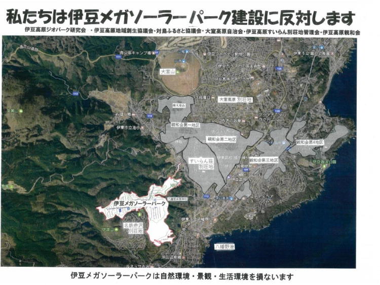いま、伊豆半島東海岸の代表的なジオサイト・大室山の目の前に韓国資本による大規模な太陽光発電施設・メガソーラーの建設が進められようとしています。