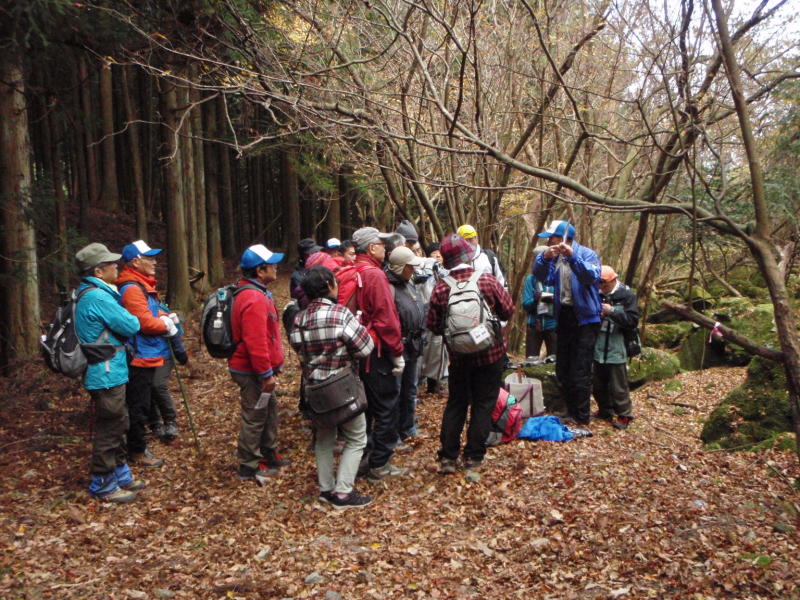 | 前日に 相当量の雨量の雨が降り、仮に天気が回復しても登山の足場は大丈夫かと懸念されました。 しかし、一夜明けると一面の青空です。安全登山を期して朝まで様子を見ていましたが、比較的に水はけのよい矢筈山の特性を考慮して,ツアーの実施を決定しました。 今日は地元の若い4人家族も,日頃目にしているゲンコツ山に登るんだと張り切って参加しました。 凛心(りこ)ちゃん(8),蓮之丞(れんのすけ)くん(12)は軽々と急坂を登って行きました。 他の参加者のみなさんも負けじと頑張りました。 途中で矢筈山誕生について、また構成岩石の特徴などについても学びました。 大量の降水のあった時に出現する通称「まぼろしの池」では水深が大人の身長程にも達することを聞いて参加者のみなさんはびっくりしながらあらためて周りを見渡していました。(写真:まぼろしの池で説明をする斉藤俊仁先生=左はし と参加者たち) 山頂から少し下のところに「ビューポイント」と呼ばれる富士山がよく見える地点がありますが、今日,ここに通りかかった時はきれいに晴れ渡り、くっきりと雪をいただいた富士山を見ることができ、歓声とともにカメラのシャッター音がしばし鳴りやみませんでした。 運悪く、頂上に立った時に霧が発生し,最高点からの眺望を楽しむことはできませんでしたが、みなさん、伊東市で一番高い急峻な岩山に登ったという満足感にひたっておられました。 今日も一人のケガもなく,紅葉の秋の登山を楽しんで頂きました。 H記 |