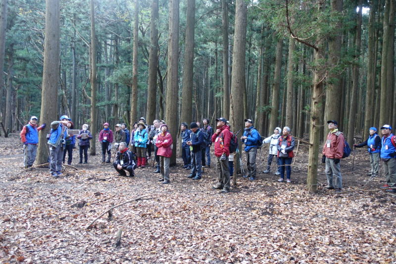 いがいが根の駐車場から林の散策路に入ると、 さっそく齋藤先生より周りに自生する トキワツユクサやホソバカナワラビについてじっくり説明を受けました。 今回のツアーも参加者全員が60〜80歳代の方々で、