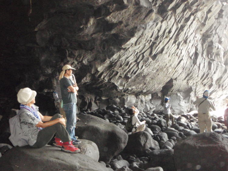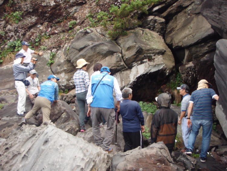 誕生真新しいゴツゴツした岩盤の浜で自然の驚異に触れながら説明を聞く一行 まつした