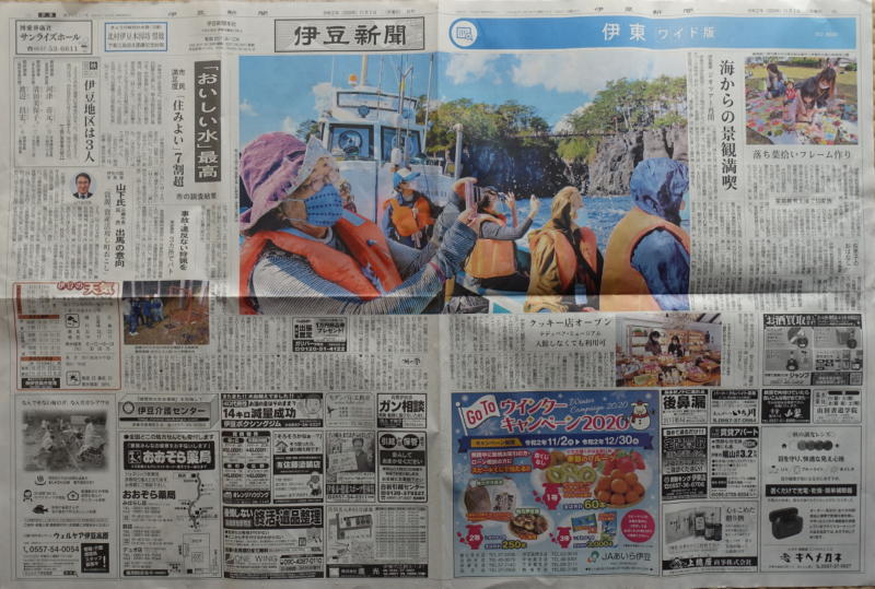 デカデカと伊豆新聞の1面と最終面を使って掲載された
