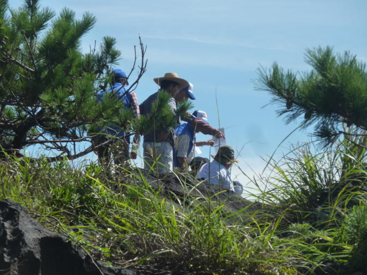 | 全国的に記録的猛暑が続く中、のろのろ大型台風10号の進路がやっとはっきりしたものの,それは日本列島直撃となり、この影響で数日前から間歇的な雨とともに強い風が吹き出しました。 開催の前日は猛暑に加え突風を警戒、私達スタッフはツアーの安全確保に全神経を集中させました。 この自然条件を考慮の上でしょう,数名のキャンセルが発生しましたが、会としては「十分な注意をすれば大丈夫」と本日のツアー実施を最終決定しました。 8時半に八幡野港の一本松駐車場に集合しましたが、海岸の高台とあってさすがに風が強く、お蔭で涼しいけど帽子が飛ばされるのが心配という状況でした。 しかし、晴れ渡った青空の下の海岸の景色は素晴らしく、青い海と打ち寄せる白い波、海岸の深い緑と吹き抜ける涼しい風が印象的でした。 いきなり生い茂る林をかき分けてツアーはスタート。観光化されず,人があまり訪れることのないこの海岸は伊東市で最も若い火山・伊雄山だけに,かろうじてつながるけもの道のような「道」は荒々しく,岩をまたぎ踏み外すと遥か下の海に落下するような所を周りの木にしがみつきながら進みました。 こうして最初に現れたのが大きな海蝕洞、通称「お釜」。約2700年前、伊雄山から流れ落ちた溶岩が海に達し海を埋めながら前進、現在の浮山別荘地を中心に海岸線を形成したのですが、一部が長い年月の間に波に砕かれ洞を作って、最後には天井部分が崩落して、南伊豆の龍宮窟と同じ地形となったものです。 今回は参加者が少なかったので,スタッフの目が届き安全確保ができると判断して、いつもは上から覗き込むだけのこの穴に降りることにしました。 上からの観察に留める数名の方を除いて、慎重にロープにつかまったりしながら「地底」に降り立ちました。海蝕洞ですから当然のことですが、そこから洞の先を見ると、そこには白い波がドーンと打ち寄せています。その先の青々とした海の向こうには伊豆大島がゆったりと横たわっています。 溶岩と波とが創り上げたこの大きな穴に立って逆光の中にこの景色を見ていると自然の圧倒的な力を感じます。 斎藤先生の熱心な説明を受けて、再び崖に挑戦。懸命にもとの道まで這い上がりました。 かくて、「ジャングル」の道は続き、新しい溶岩と波の様子が猛々しい まつした や珍しい曲面節理が観察できる もとせの浜 を見て浮山別荘地の高さまで戻りました。 血塚、旧下田街道を経て汗びっしょりになって昼食のため敷地の一部をお借りしている伊豆急・赤沢ルネッサに到着。思い思いに冷たい飲み物やアイスキャンディーなどを補給して、木陰でそよ風を顔に受けながらそれぞれのお弁当を賑やかに頂きました。 今日は天候のコンデションに配慮して、会として特別にツアーに見え隠れして走る「伴走車」を用意しました。昼食時にはこの伴走車のスタッフが冷たい水や氷をサービスし、参加者のみなさんに大いに喜ばれました。 昼の休憩で一躍元気を取り戻した一行は、このあと、伊雄山の溶岩流が形成した珍しい溶岩堤防やスコリアラフトとみられる巨大な岩、しいのき3本などを見学して駐車場まで戻ってきました。 暑い中,結構な道程を歩きましたが、参加のみなさんは楽し気に話もはずみ、私達スタッフとしては、今日がみなさんのこの夏の良い思い出の一つになってくれればいいなと思いつつ、お別れを致しました。 H記 |