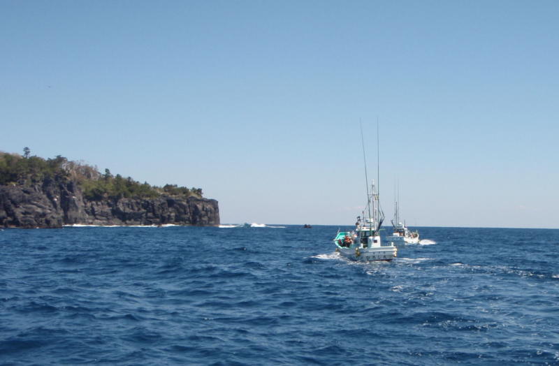 | 天気は絶好。朝6時に船頭さんと今日の海上の状況をチェック。 釣りやダイバーなら気にしない程度の波はあるが「大丈夫だろう」という判断で今日のツアーを予定通りに実行することを決定しました。 ところが集合時刻のころになると急に風が出て、沖には白波がチラホラ。 船の運航や安全には何の心配もないが,船の揺れに慣れない参加者の方々にとって、船酔いや転倒事故などトラブルは大丈夫か・・・・と運航を担当する漁協や船頭さんとジオ研の会長が懸命に状況の分析や対応策を検討、先行して開始した座学(今日のコースを順にスライドで紹介し、ジオ的説明をする)の間にギリギリで船出を決定しました。 問題は船酔いであることを参加者の皆さんに説明し、全員が「頑張る。船出しよう」ということになり、酔い止め薬など思い思いに対策をして3隻に分かれて乗船しました。 出港して定置網の近くを抜けて折り返しの川奈の南端あたりまではさすがに波もあって時折潮が風に舞ったりする場面もありましたが、沖に出て海岸沿いに南下を始めると風は順風にもなって,天城や遠笠山、大室山をはじめ、東伊豆の「東部火山群」が手に取るように居並ぶ姿が展開しました。 いつもは徒歩で探っているジオサイトが今日は左右に前後に展開して、まさに「昨日は木を見て、今日は森を見ている」感じです。 船のあちこちから「わあ、素敵!」と感嘆の声が湧き立ちます。 赤沢の沖まで南下した船はここで伊雄山や大室山の溶岩が流れ落ちた海岸線に再び接近。今度は綺麗な柱状節理や海蝕洞が連なる荒々しい海岸を観察しながら北上します。この頃にはもう海はすっかりのどかな風景となって,青い海の岩場に立って釣り人達が竿を上げ下げしている前を通過して行きます。 今月の初めには到着していたアマツバメが、今日はどこか他へ餌を求め飛んで行って留守にしているようで、つばくろ島に接近して探しましたが、残念ながら姿を見ることは出来ませんでした。 座学の時にお配りしたコースに沿ってポイントとなるスポットを配した写真を片手に忙しく現地を確認しながらジオを楽しんでいるうちに、アッという間に2時間のクルージングは終了してしまいました。 下船してみたら、「参加者・スタッフとも全員が船酔いゼロ」だったようで、出港をめぐる船出までの真剣な検討が杞憂に終わったことが何よりだったとつくずく思いました。 H記 |